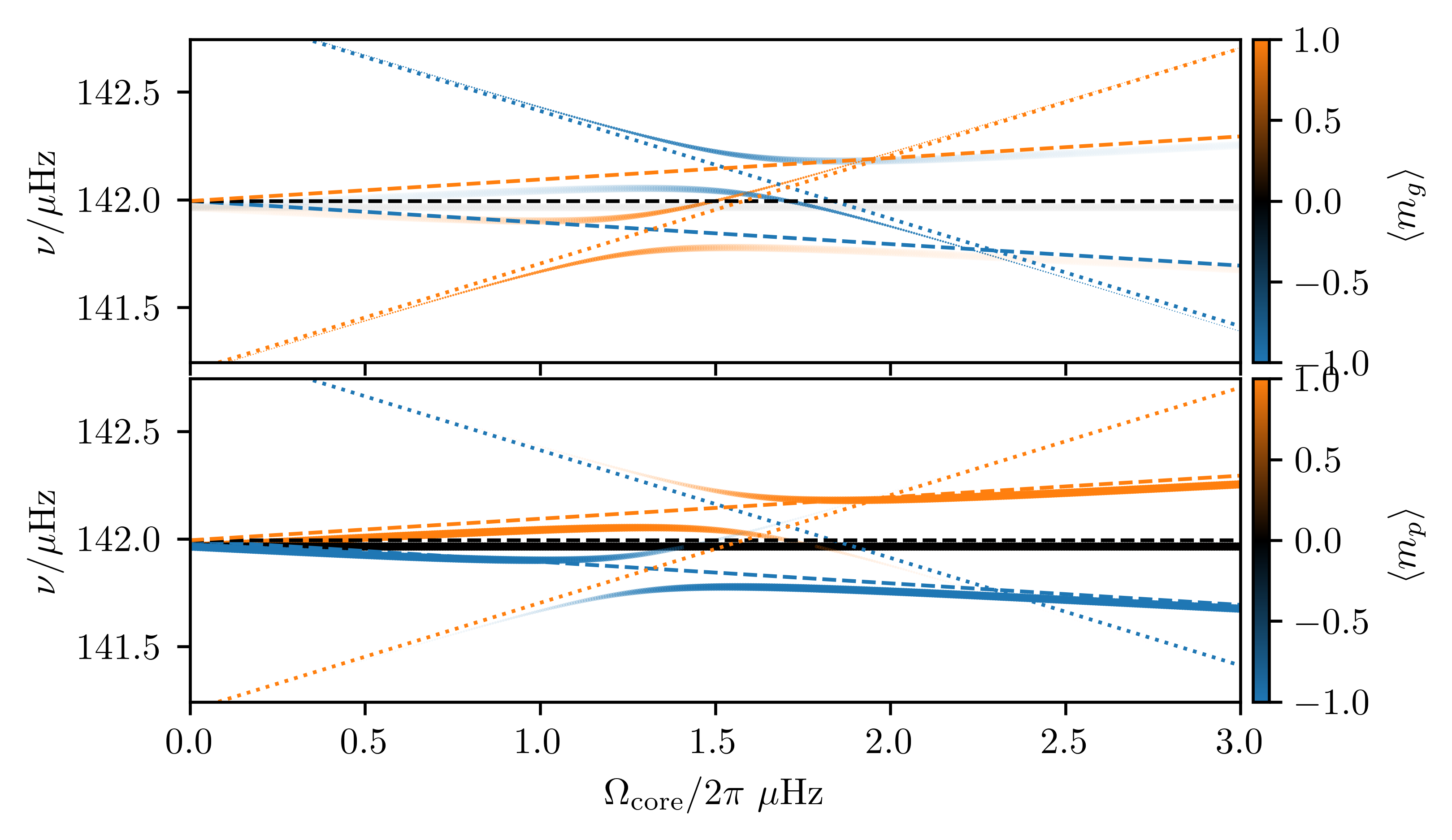 \[\scriptsize \delta \nu_{\text{mag}, g, \ell=1} \sim {m^2 \over \nu^3}\]