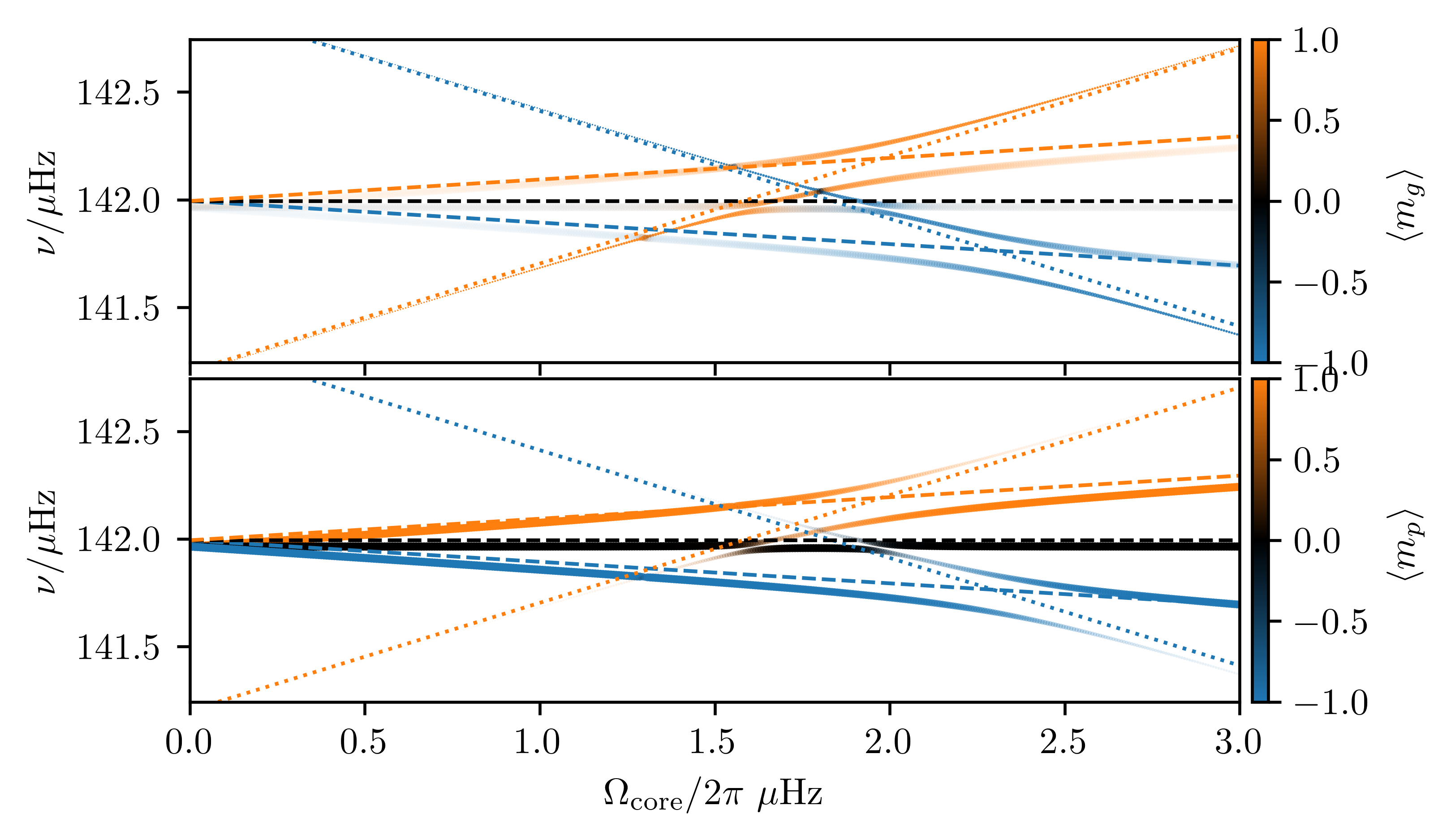Pure g-modes: \[{1 \over \nu_{n,\ell}} \sim \Delta\Pi_\ell \left(n_g + {\ell \over 2} + \epsilon_{g, n,\ell}\right)\]