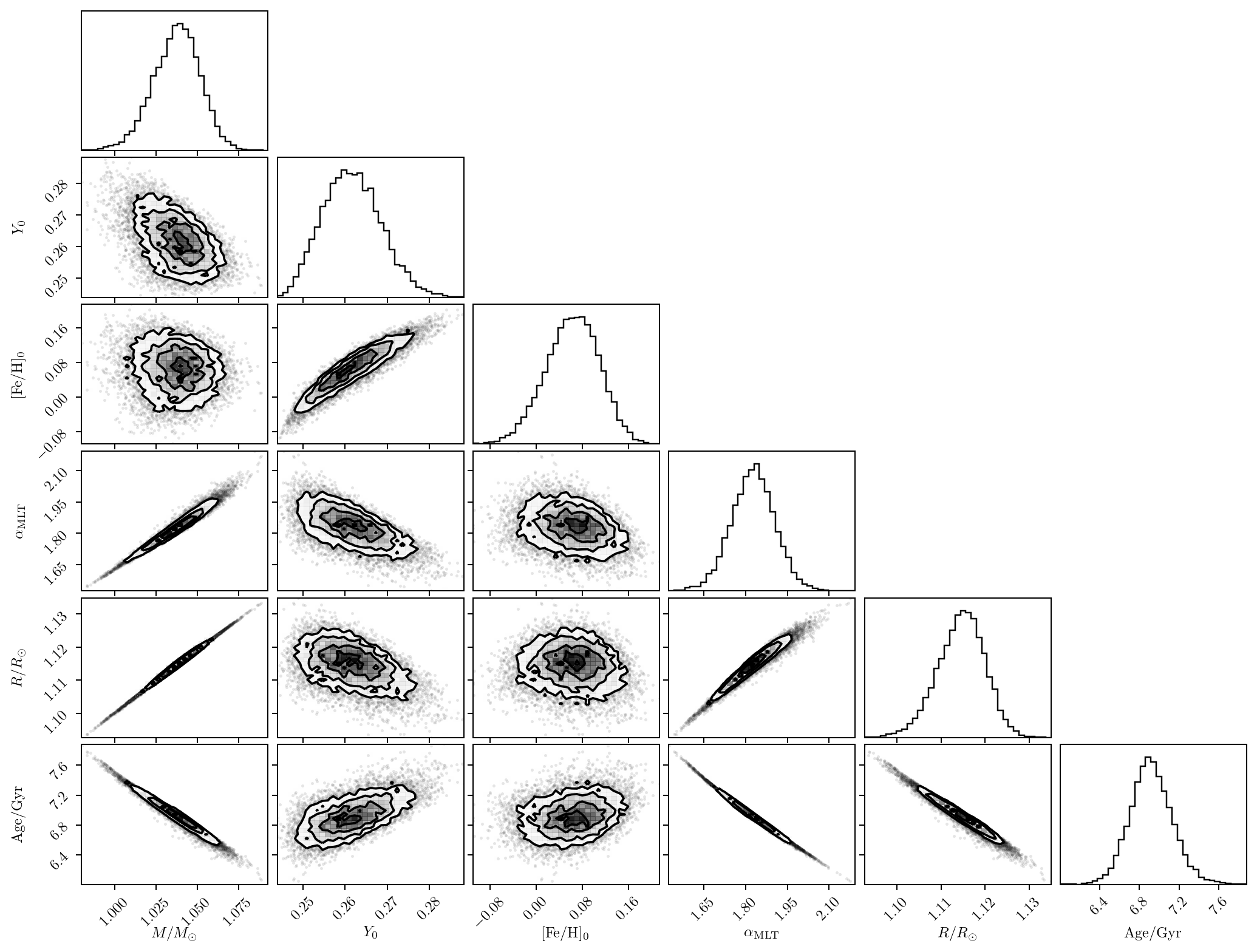 \[F: \underbrace{\left(M, t, Y_0, Z_0, \alpha_\text{mlt}, \ldots\right)}_{x \in X} \mapsto \underbrace{\left(L, T_\text{eff}, [\text{M/H}], \log g, \ldots\right)}_{y \in Y}\]